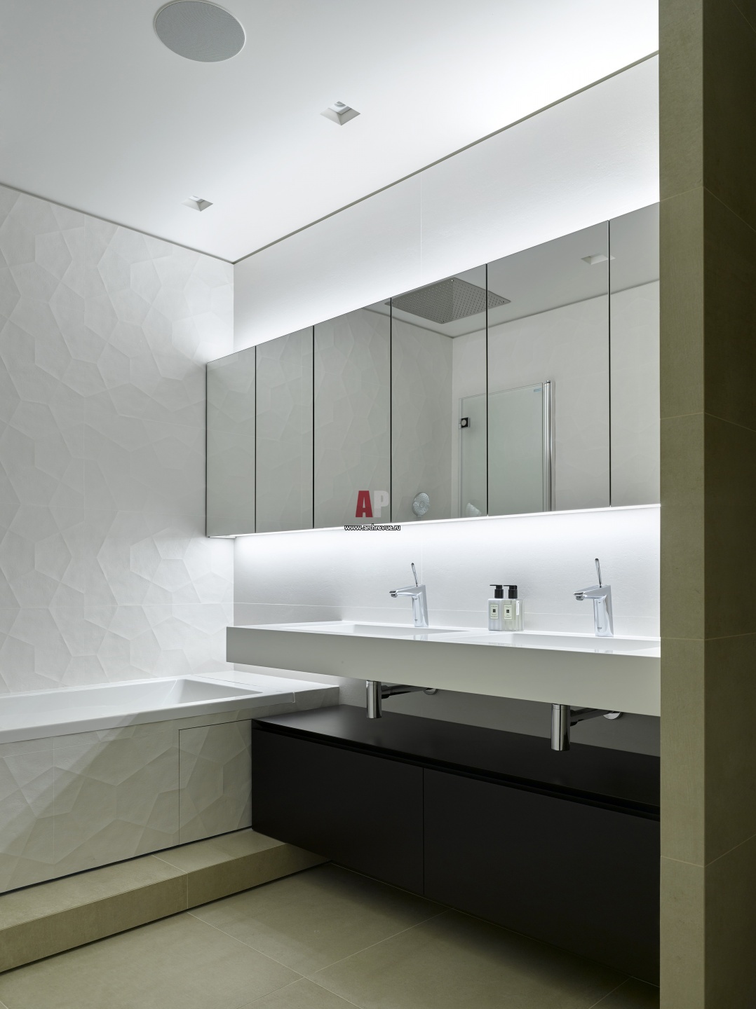 Хозяйский санузел оформлен белой плиткой с рельефной фактурой, напоминающей мятую бумагу. Столешница на две раковины оформлена нижней подсветкой. Зеркальный шкаф не скрадывает пространство, а наоборот – приумножает его.