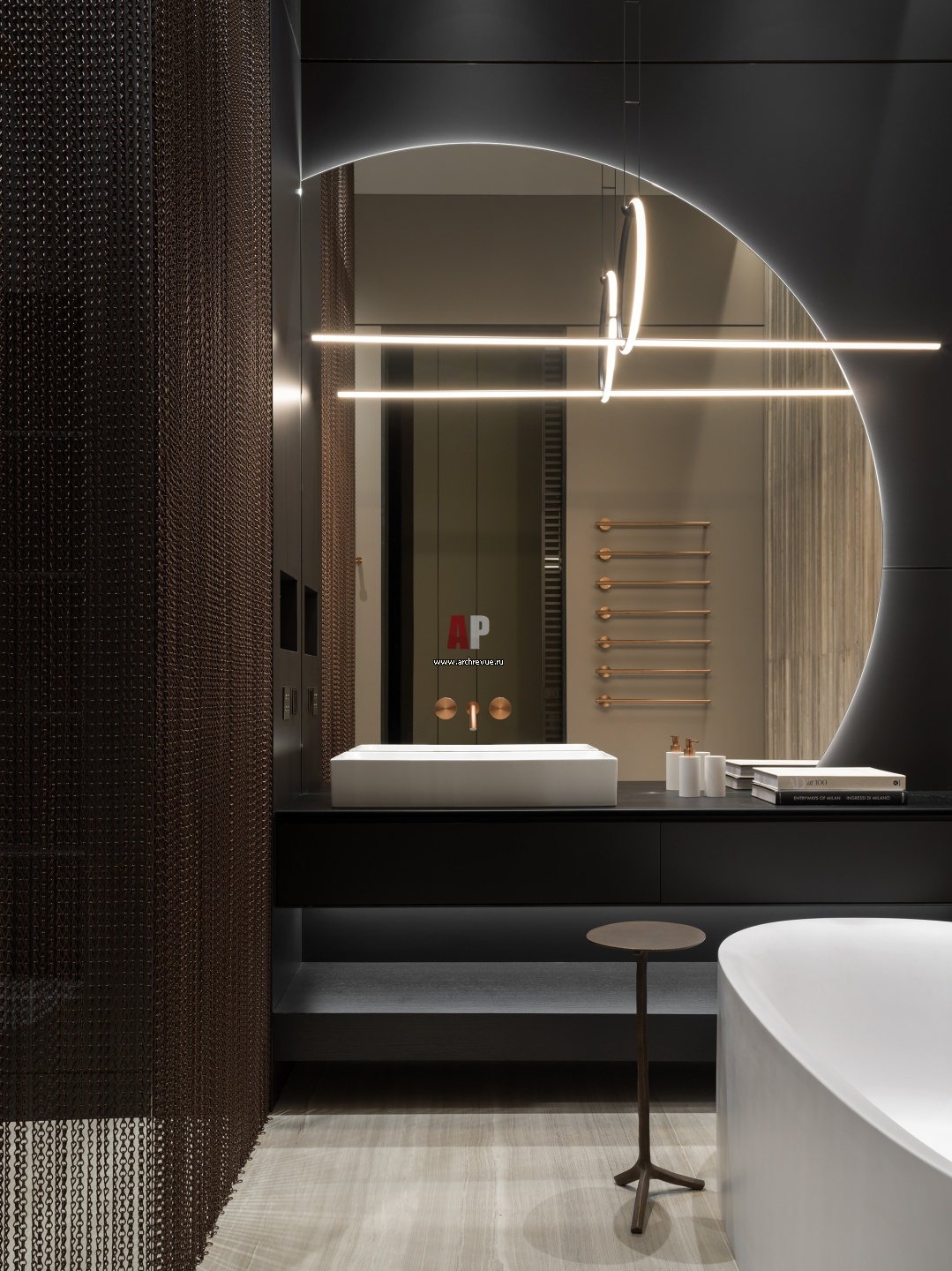 Мастер-санузел. Подвесная тумба, Antonio Lupi. Зеркало, De Castelli. Ванна, Boffi. Сантехника, Ceramica Cielo. Смесители, Cea.