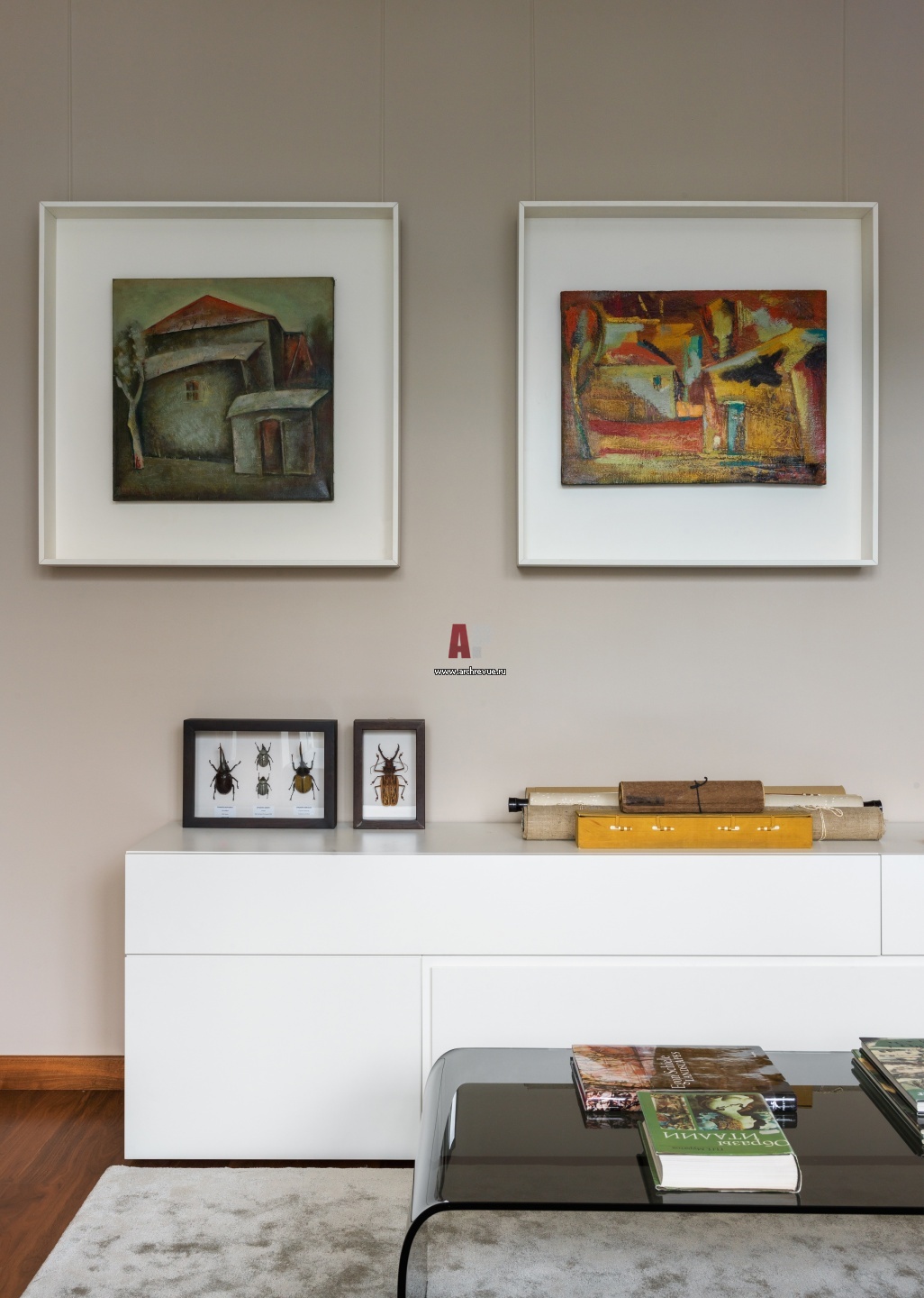 Минималистский интерьер гостиной. Белый комод, Cattelan Italia. Рамы для картин сделаны на заказ в общей стилистике интерьера.
