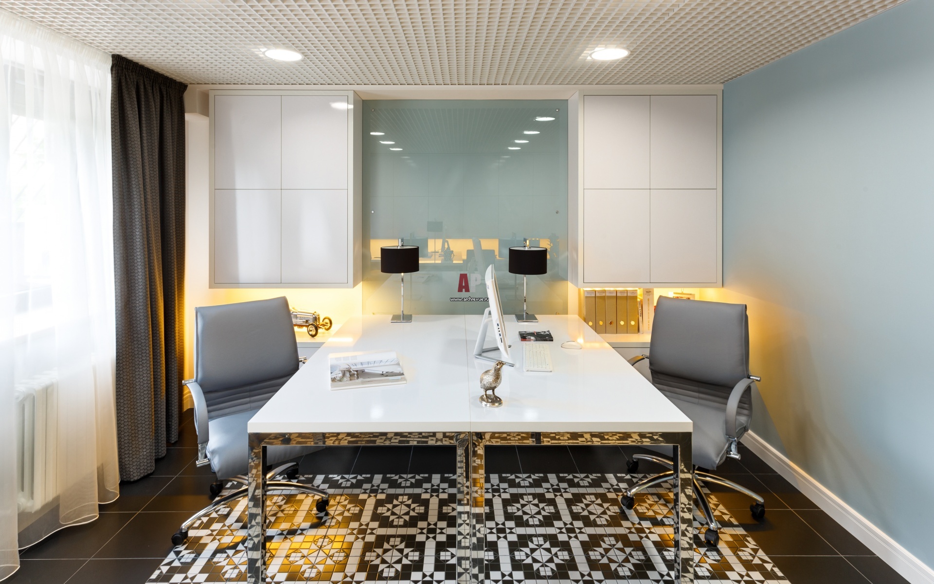 Интерьер рабочего кабинета сотрудников. Встроенные шкафы с нижней подсветкой, словно парят в воздухе. Центральная вставка из каленого стекла визуально увеличивает помещение. Хромированные ножки белых столов отражают черно-белую напольную плитку.
