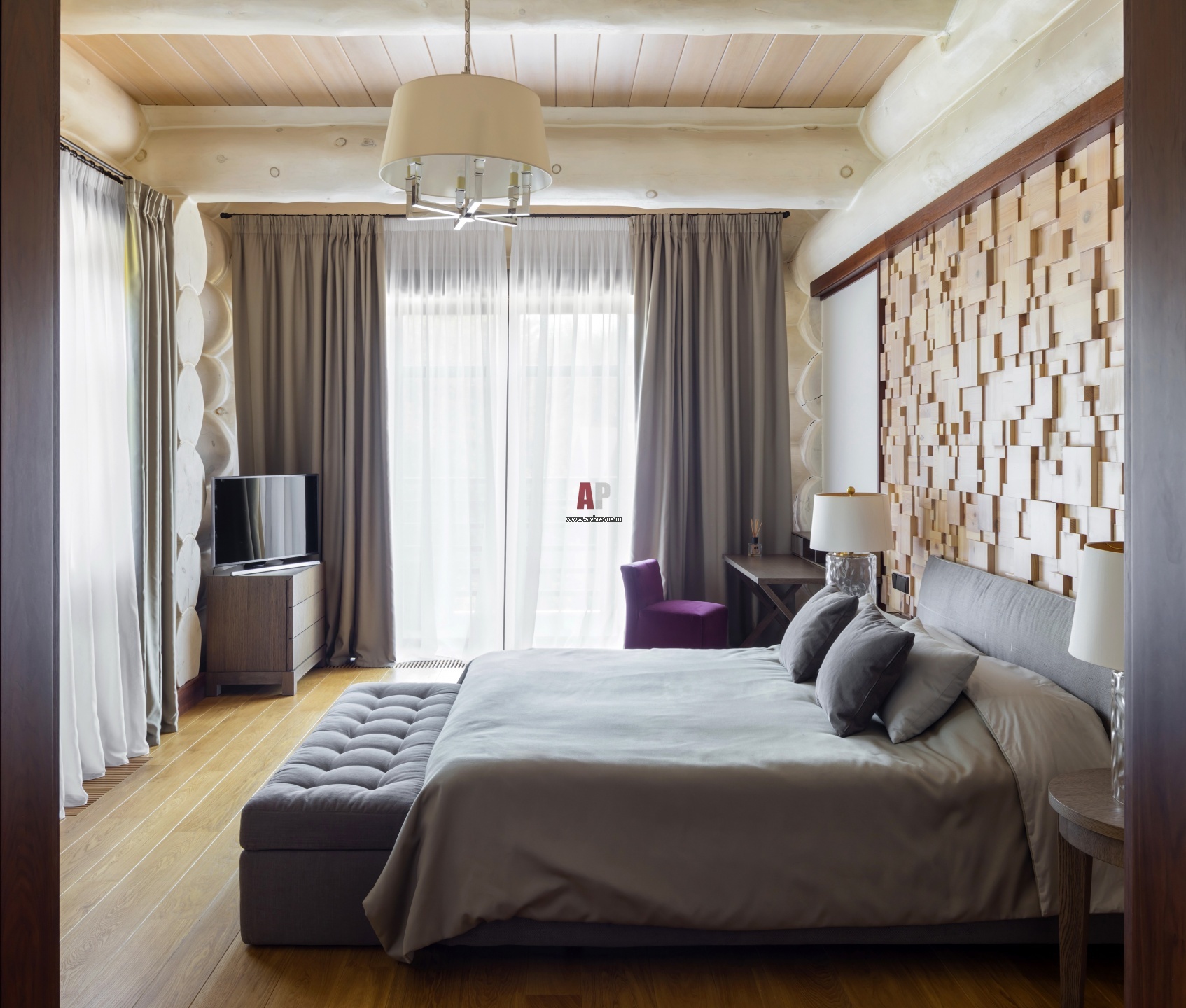 Интерьер гостевой спальни на втором этаже. За изголовьем кровати панно из деревянной мозаики, использованы плашки выбеленного дерева.