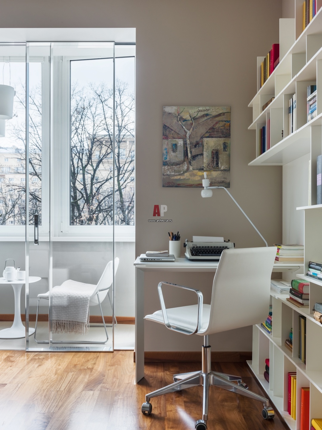 Зона кабинета в гостиной. Секретер и рабочий стол сделаны на заказ на российском производстве и интегрированы в модульную систему Cattelan Italia. Стол спроектирован так, что весь конструктив изделия, несущие элементы, спрятаны внутрь, внешне видны лишь тонкие перекладины, которые рифмуются с дизайном стеллажа. Рабочее кресло, Gallotti & Radice.