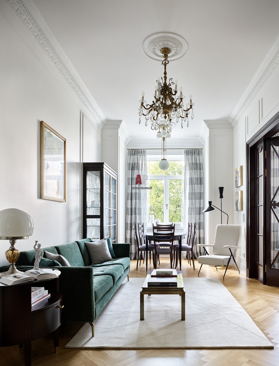 Гостиная. Диван BoConcept, модель Osaka. Кресло, винтаж, 1960-е годы, Италия. Журнальный столик, Maison Jansen. Люстра хрустальная, 1940-е годы, Испания.