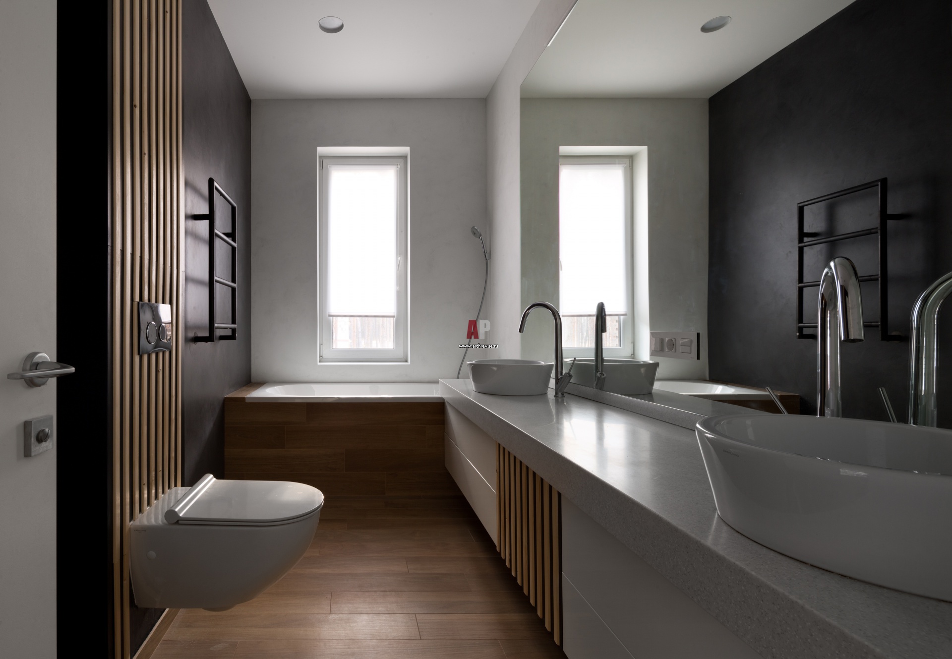 Фото интерьера ванной комнаты в стиле эко-минимализм. Стены покрыты штукатуркой под бетон, декоративные акценты выполнены из светлых деревянных реек. Столешница из серого искусственного камня.