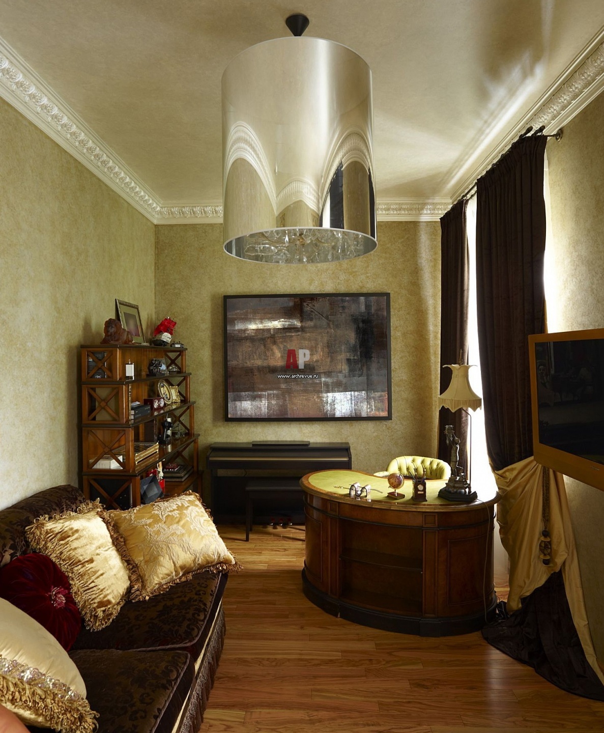 Интерьер кабинета решен в стиле спокойной, респектабельной классики. Яркая современная деталь в нем – металлический светильник, MOOOI. Диван, рабочий стол, Provasi. Кресло, Mascheroni. Книжный шкаф, Grande Arredo.