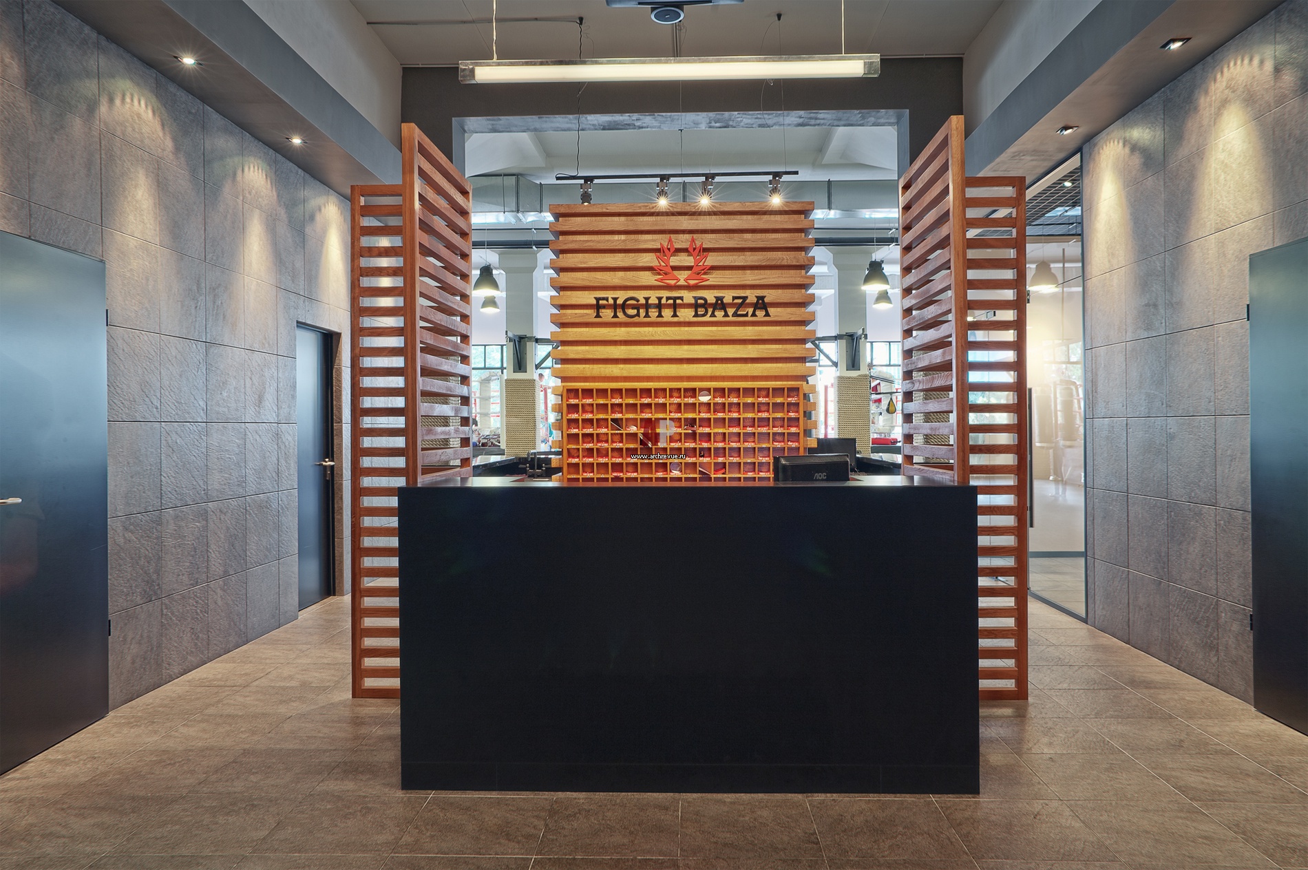 Стойка респшен центрирует помещение клуба. Она акцентирована деревянными конструкциями в японском стиле, изготовление «ЭСИ». Стены облицованы керамогранитом Italon с фактурой натурального камня, поставщик BARS RED.