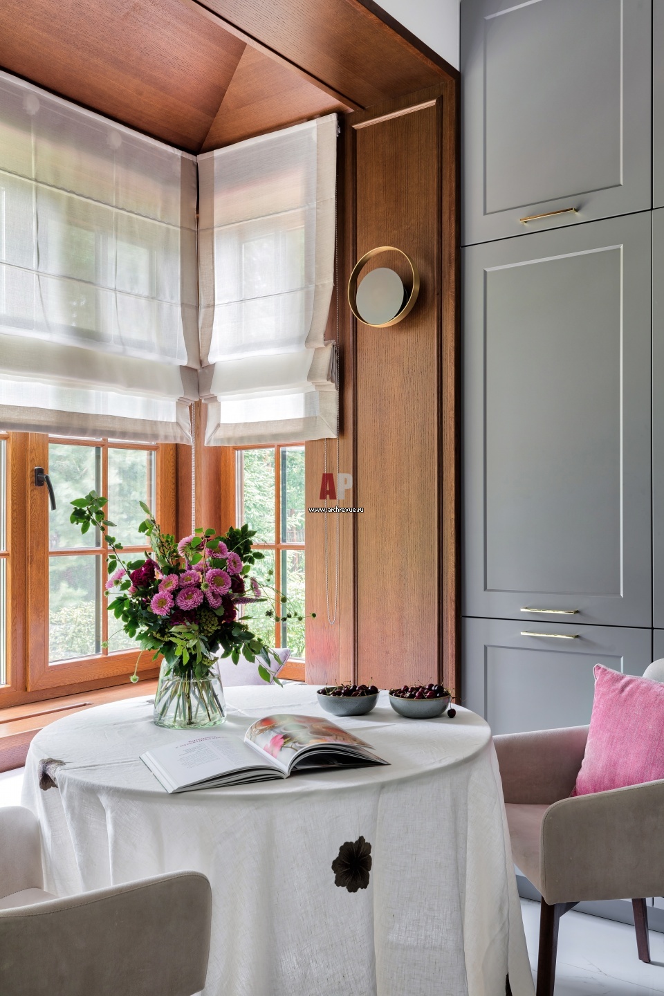 Зона для завтраков на кухне расположена в эркере. Настенный светильник, Venicem.