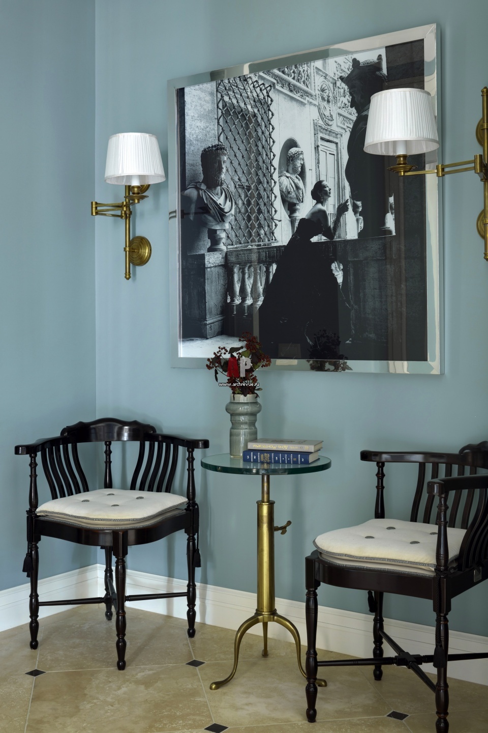 Интерьер прихожей. Стол, стулья, Eichholtz. На стене – черно-белая фотография с интерьером классического палаццо.