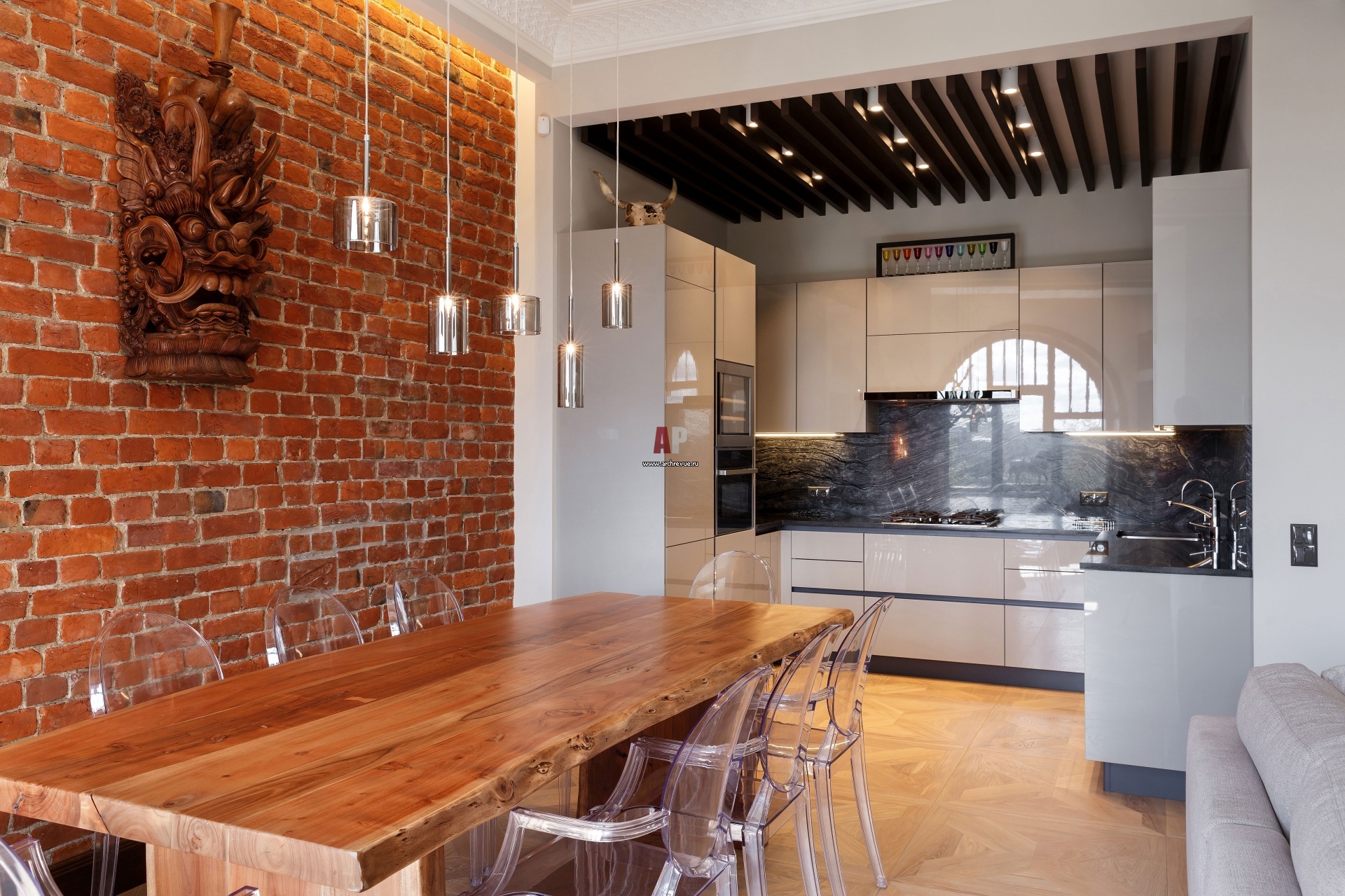 Торцевая стена столовой открывает родную кирпичную кладку дома.