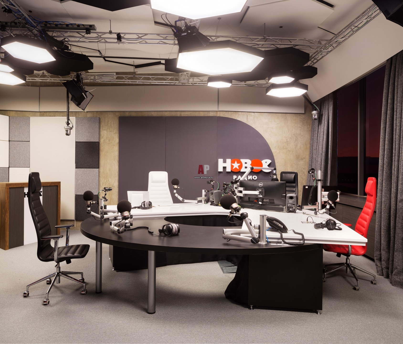 Интерьер студии прямого эфира в офисе радиостанции. Высокий класс звукоизоляции обеспечивают межкомнатные перегородки из пеноблоков и акустические стеновые и потолочные панели Ecophon. Круглый стол с креплениями для микрофонов сделан на заказ.