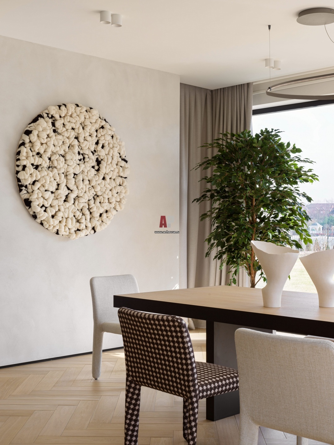 Дом у озера с природной палитрой и текстурами. Столовая.