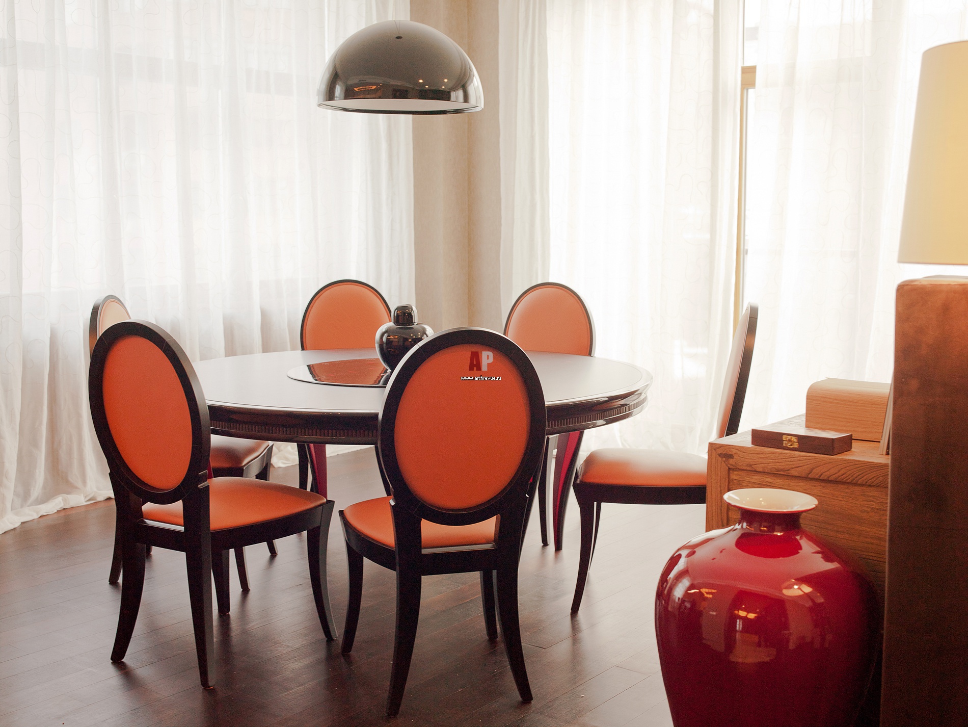 Столовая группа в гостиной. Мебель отделана красной кожей. Справа – выход на балкон.
