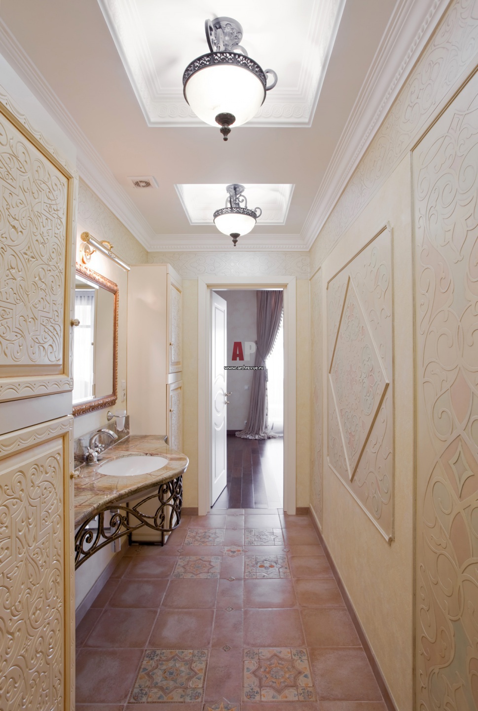 Санузел оформлен в восточном стиле. Стены украшены рельефными росписями.