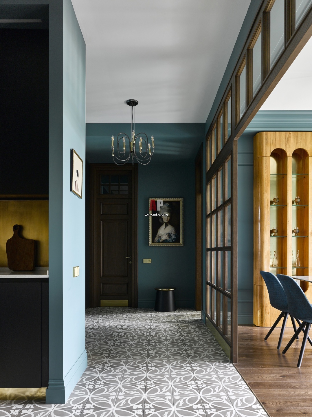 Прихожая, коридор и кухня объединены в общее пространство. В главной роли здесь глубокий сине-зеленый тон, дополненный латунью и различными оттенками дерева. Люстра, Favourite. Столик, LaForma, модель Phil.
