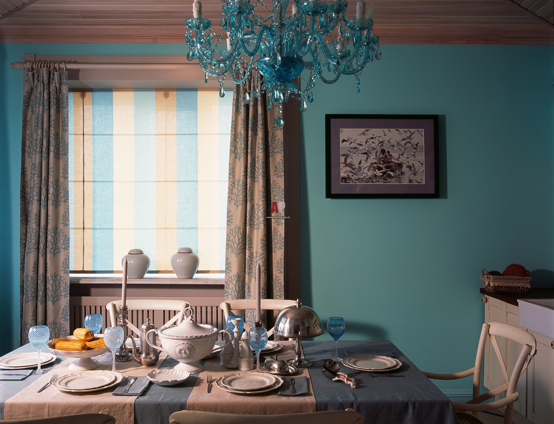 Интерьер столовой выдержан в средиземноморском стиле. Стены выкрашены в бирюзовый цвет, потолки зашиты деревом, на столе – скатерть и салфетки из ткани с грубой фактурой.