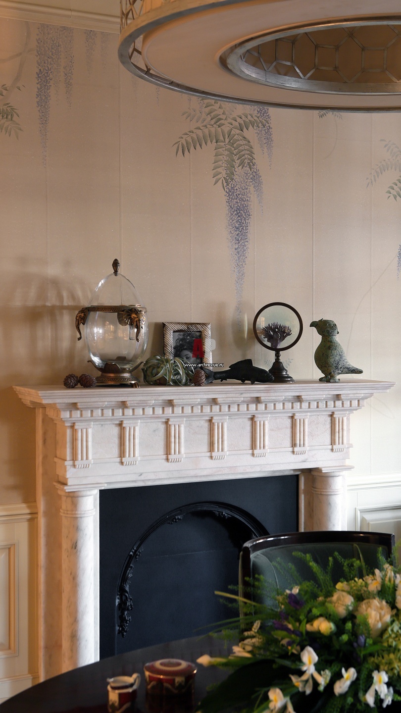 Портал камина выполнен из светлого мрамора с резьбой итальянскими мастерами по индивидуальному заказу.
