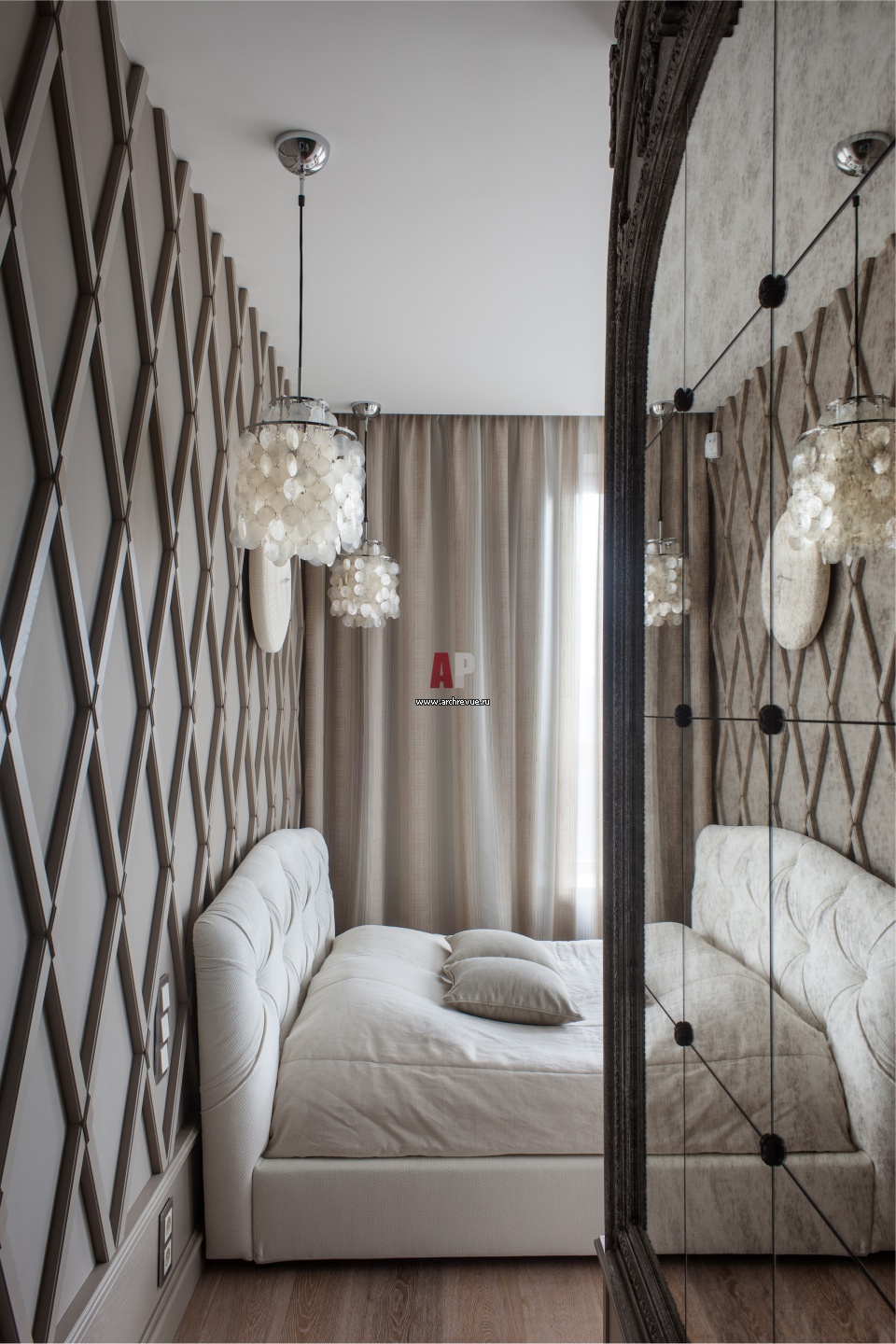 Интерьер спальни цвета кофе со сливками. На полу – широкая инженерная доска с сучками и трещинами, брашированный дуб, ArdenParkett. Деревянные стеновые панели (ромбы), высокие фигурные плинтуса под покраску стен, индивидуальный проект.