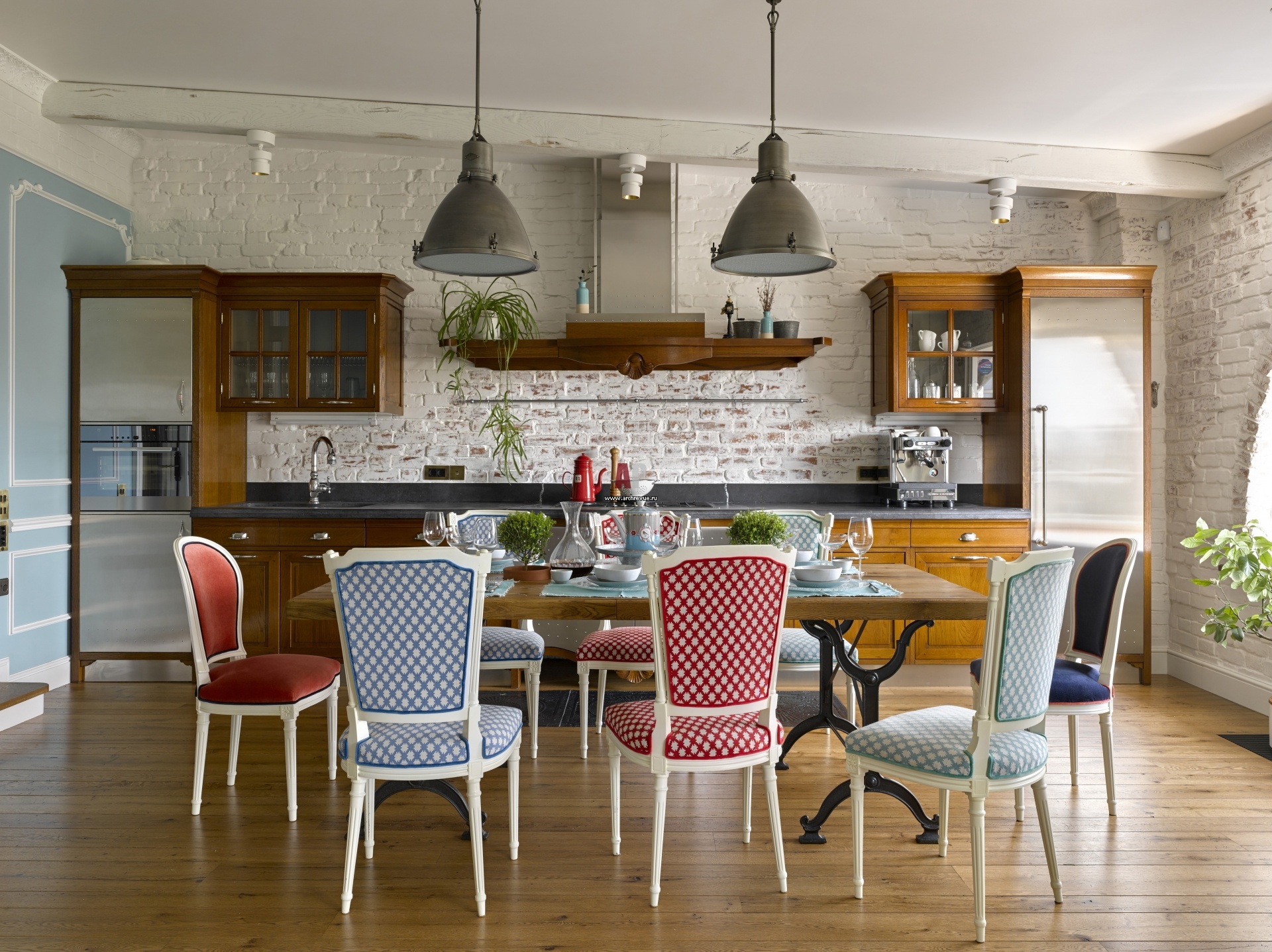Зона кухни-столовой в общей гостиной. Стулья и подстолье антикварные, столешница из античного дуба. Стулья из Парижа переобиты тканью, Manuel Canovas. Кухня, Marchi Group. Прожекторы на балке, Centrsvet.