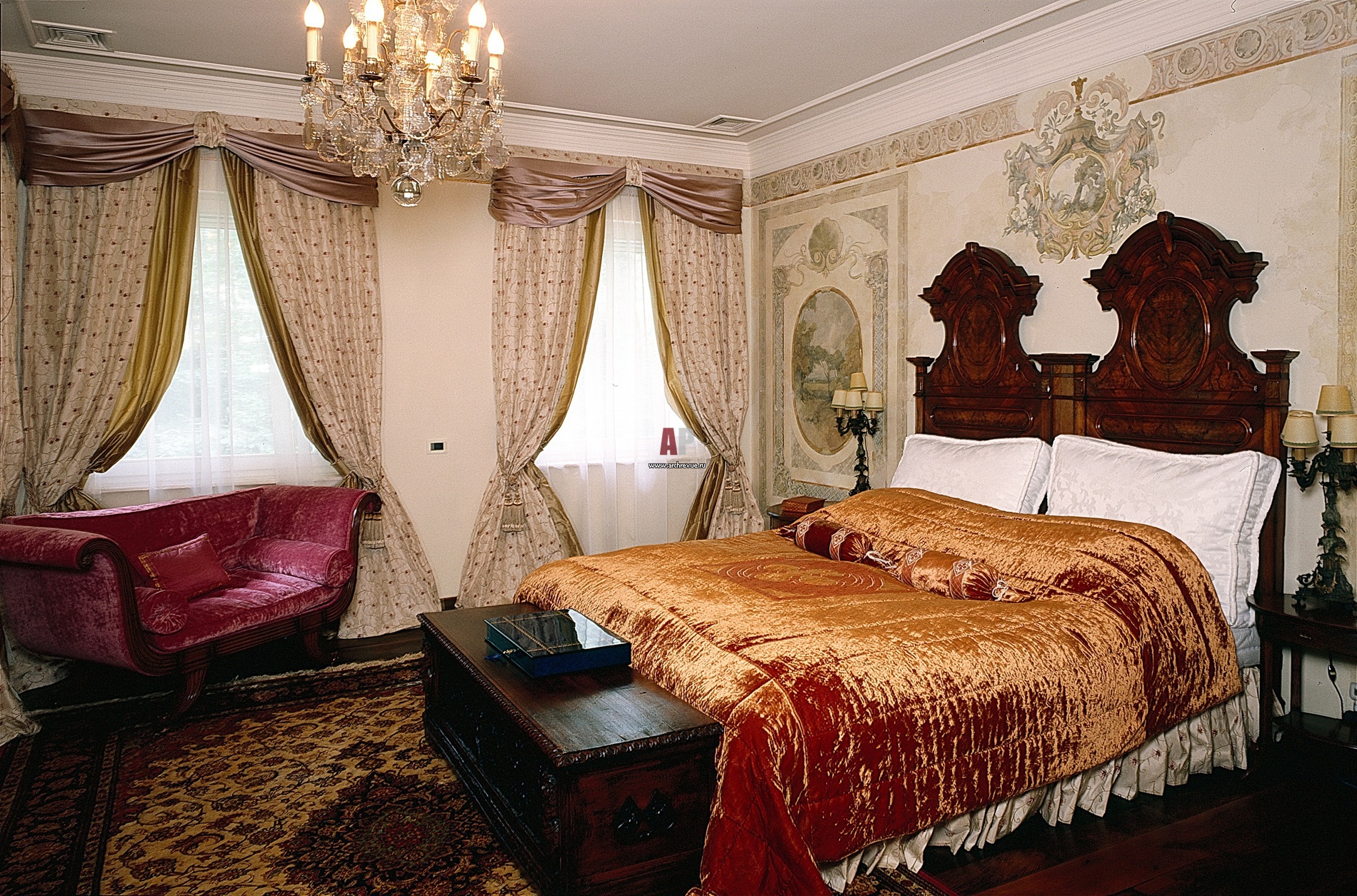 Изголовье кровати в спальне антикварное. К изножью кровати придвинут резной сундук XVIII века. Светильники сделаны из французских канделябров, купленных на блошином рынке. Стена оформлена росписью, прообразом для нее послужила фреска из итальянской виллы.