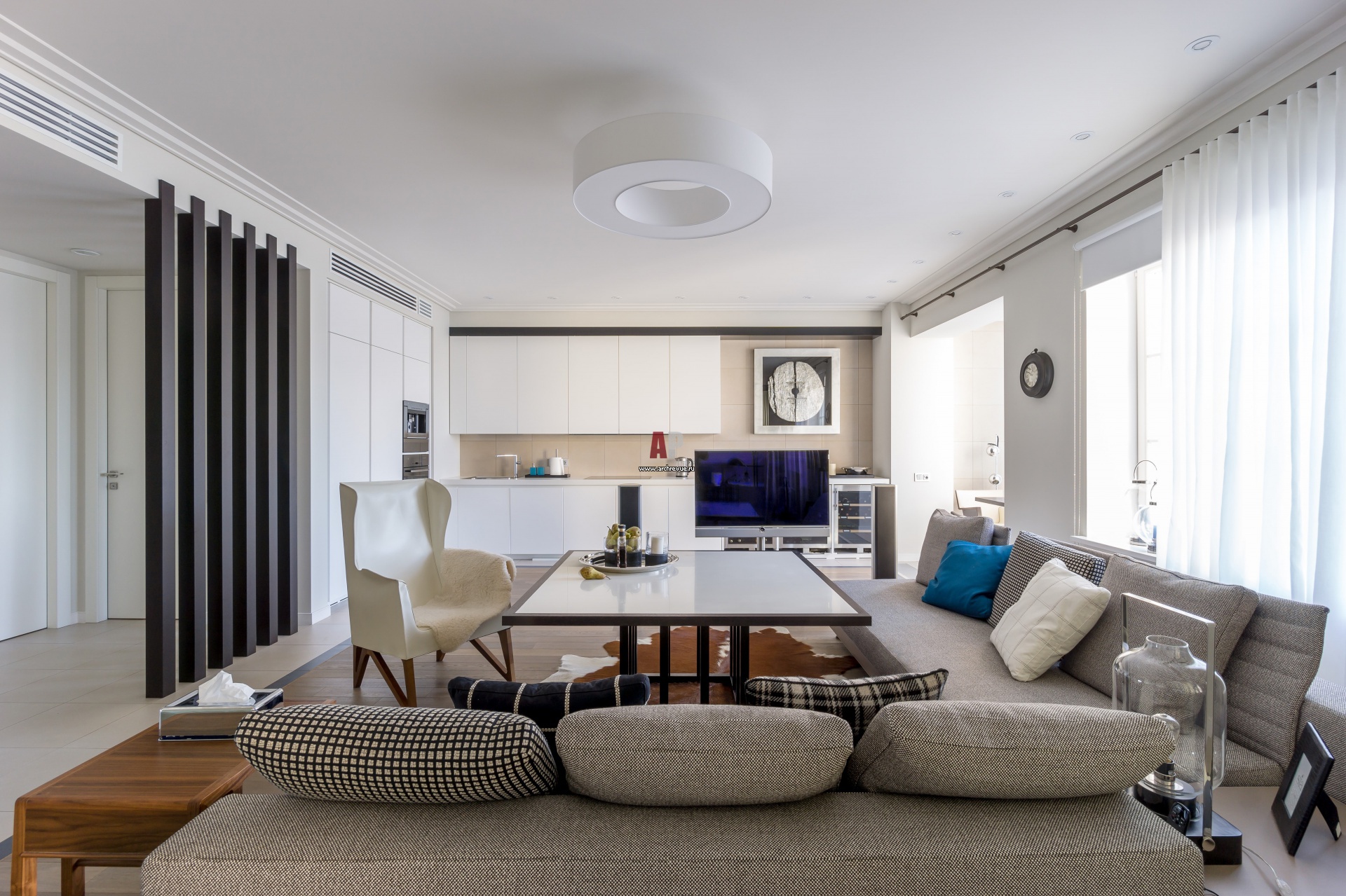 Дизайн квартиры-студии выполнен в духе лакшери-отелей. Светлая гамма, эргономичное зонирование, наличие дизайнерских объектов – все выполнено в стилистике современного итальянского дизайна. Большие серые диваны, Minotti.