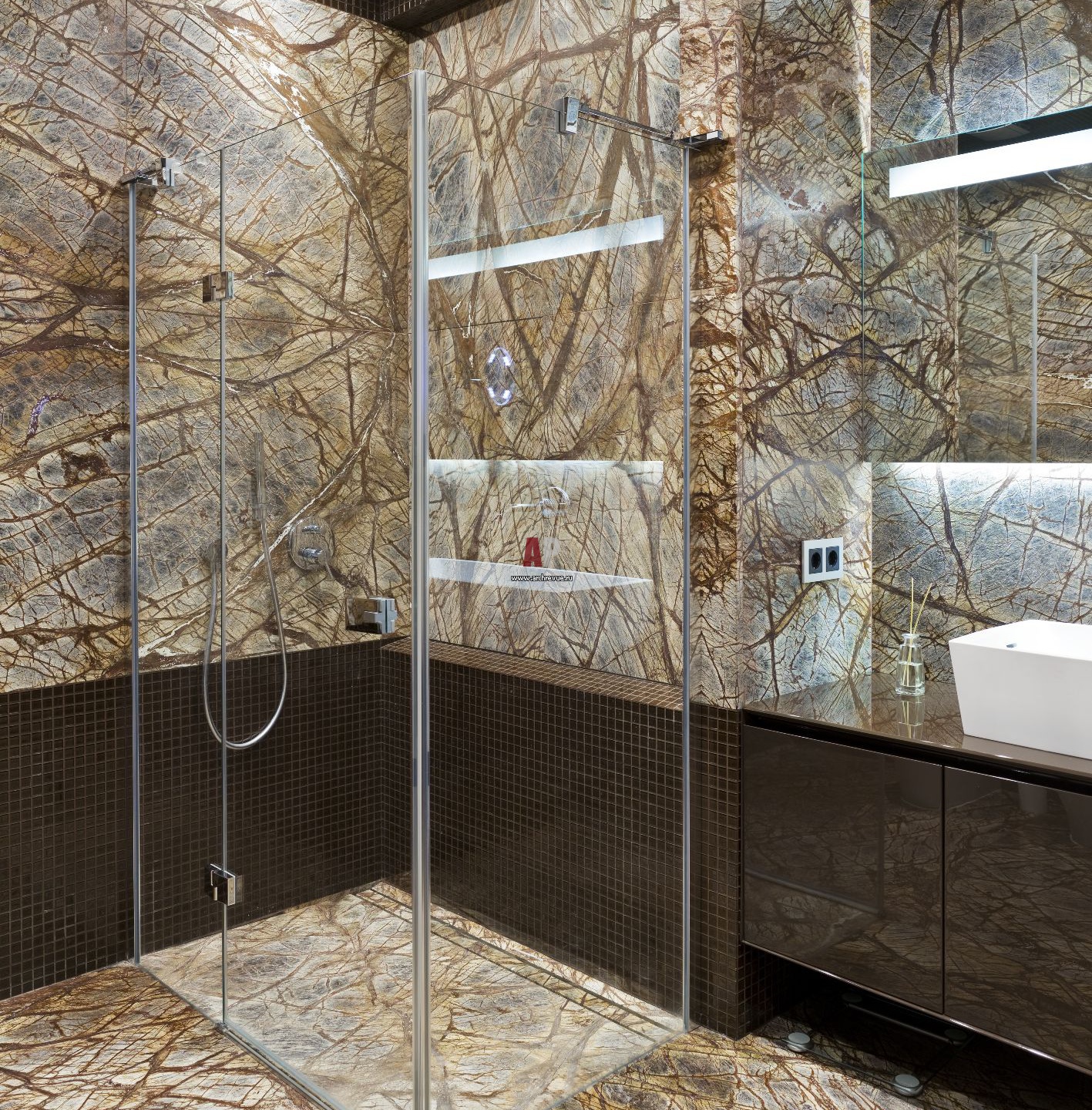 Ванная отделана мрамором Bedosar Brown, поставщик «Рубин». Его особенность – необычный природный рисунок.