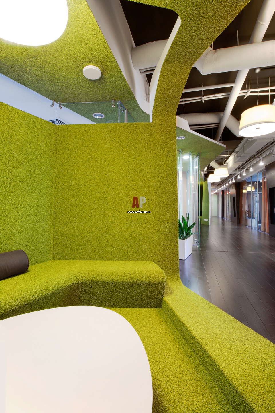 Сидения вмонтированы по периметру сложного объема. Изнутри «ячейка» зашита зеленым ковролином InterFace FLOR. Авторы проекта Петр Зайцев, Арсений Борисенко, архитектурное бюро za bor.