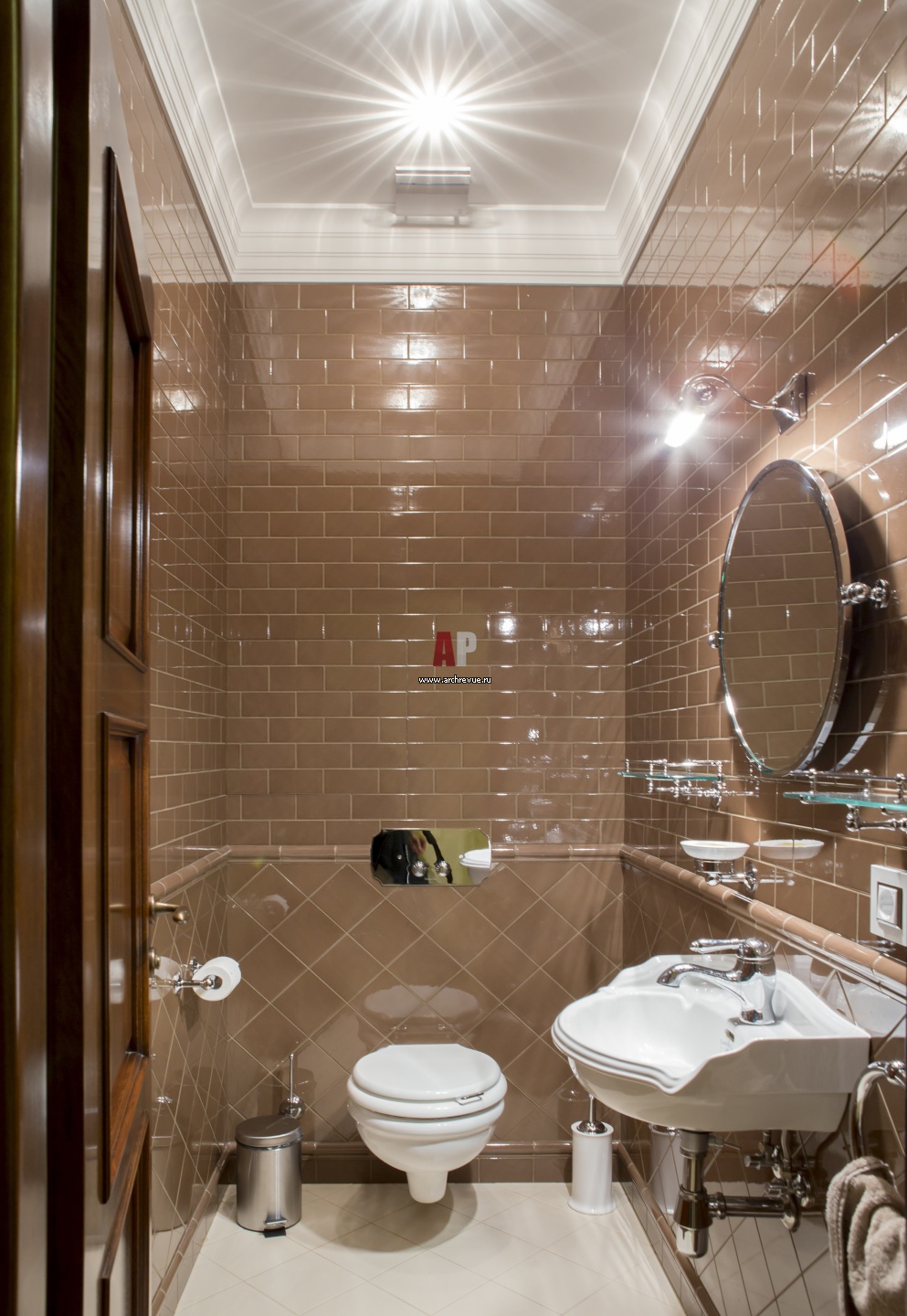 Интерьер санузла с элементами английской классики. Стены от пола до потолка декорированы английской керамической плиткой оттенка кофе с молоком с глазурью. Сантехника, Devon & Devon.