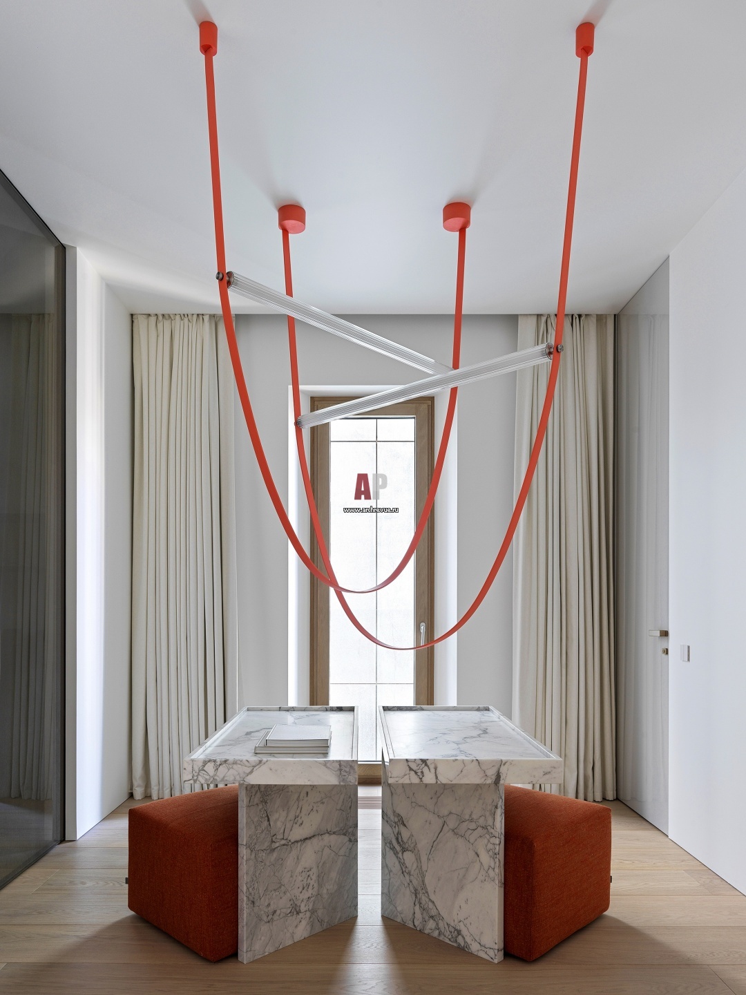 Центральный холл. Подвесной декоративный светильник Flos. Мраморный стол выполнен на заказ. Пуфы, B&B Italia. За тонированными раздвижными перегородками находится гардеробная.