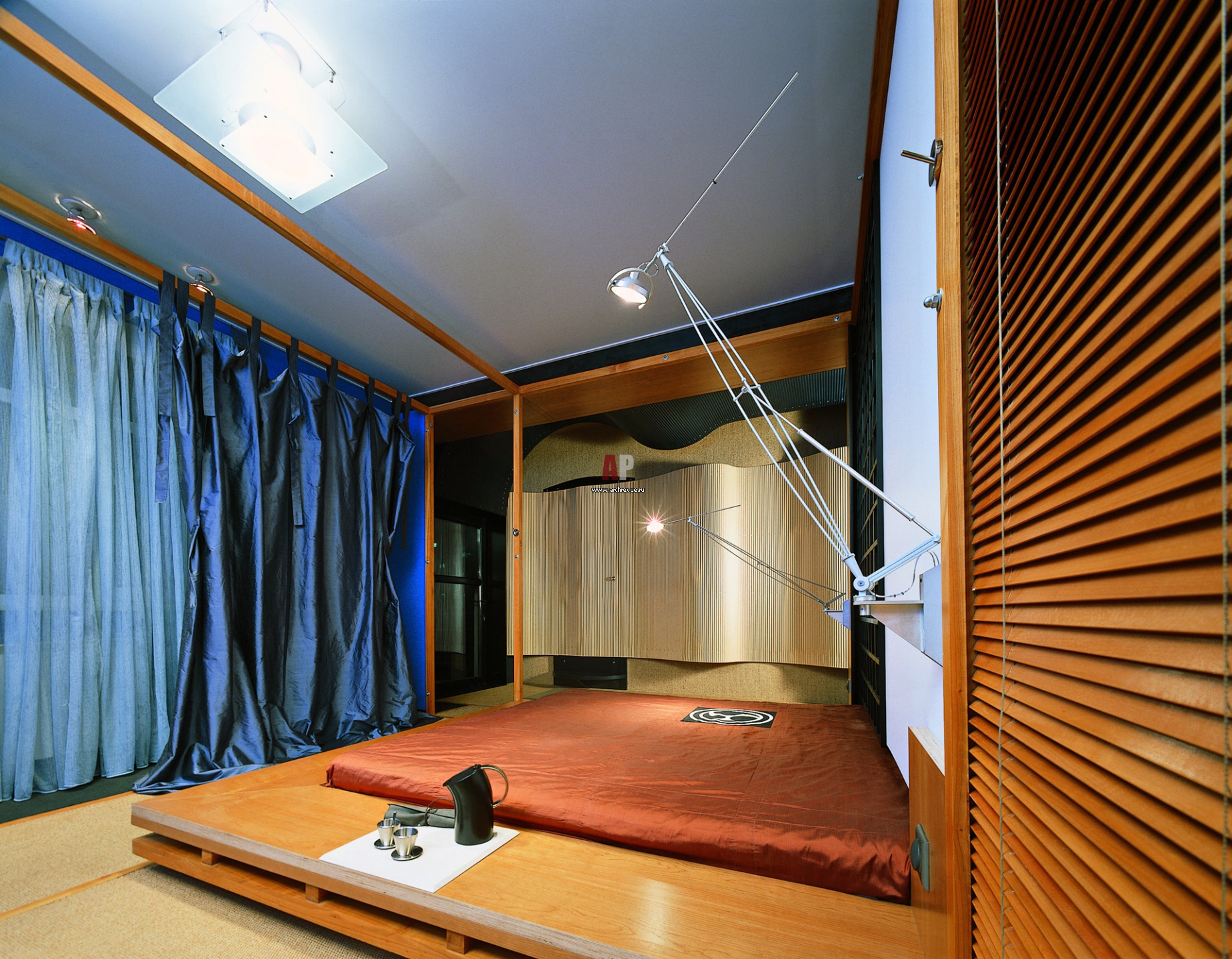 Спальня хозяев в японском стиле. Конструкция кровати напоминает традиционное японское место для сна – матрас на деревянном подиуме-настиле.