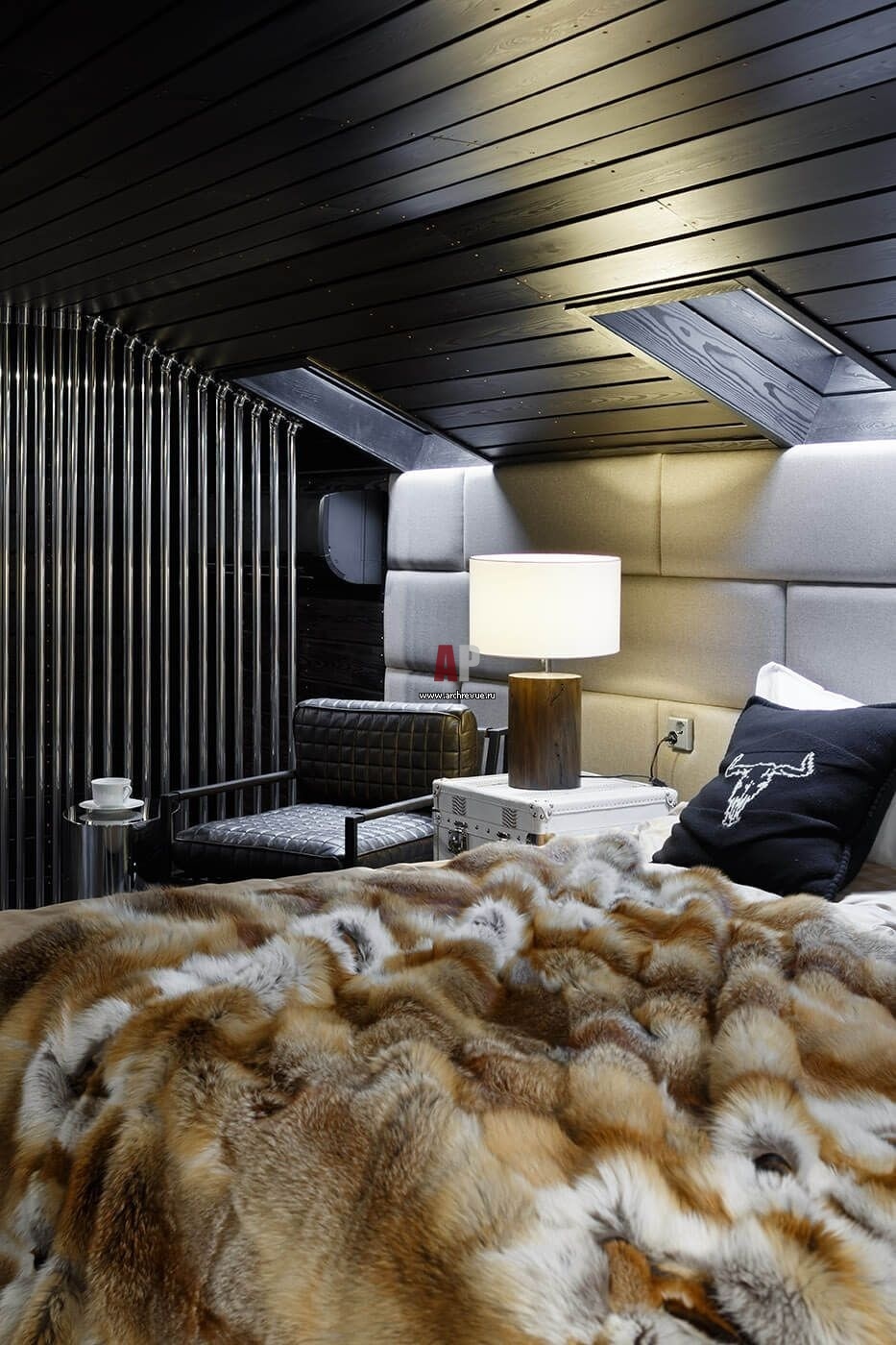 Интерьер спальни в стиле современного шале с деревянным потолком, реечной перегородкой и меховым пледом. Мансардные окна, VELUX.