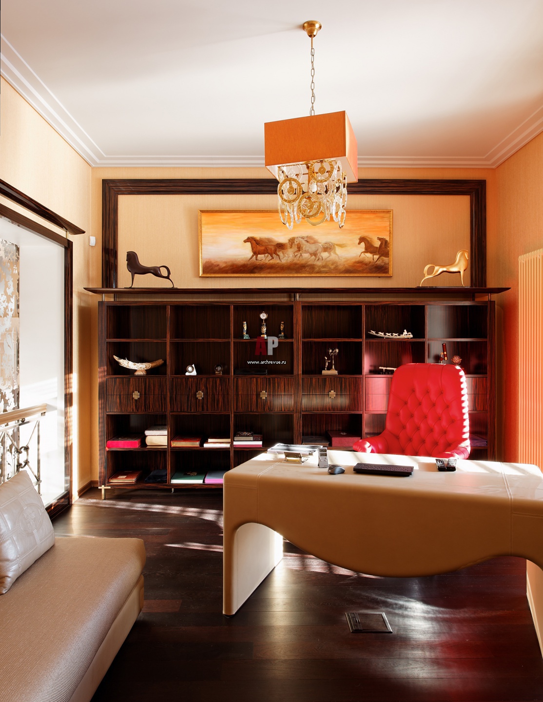 Кабинет расположен на втором этаже, и из него открывается вид на двухуровневое пространство гостиной. В оформлении кабинета прослеживается стилистика ар-деко. Мебель Oak.