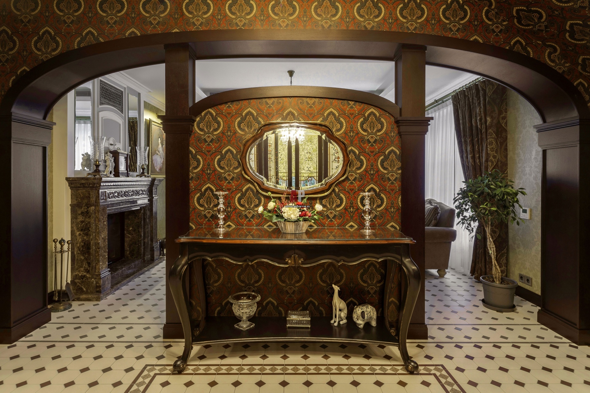 Гостиная отделена от холла эллиптической перегородкой из тонированного дуба. Стены оформлены обоями с классическим английским орнаментом, Ralph Lauren. К перегородке примыкает консоль из темного дерева.