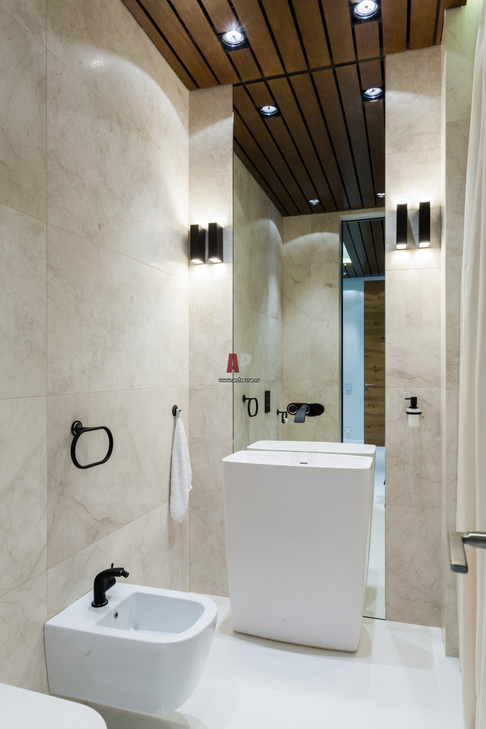Гостевой санузел оформлен в стилистике всего этажа. Стены облицованы камнем, потолок подшит деревянными панелями. Сантехника, Duravit.