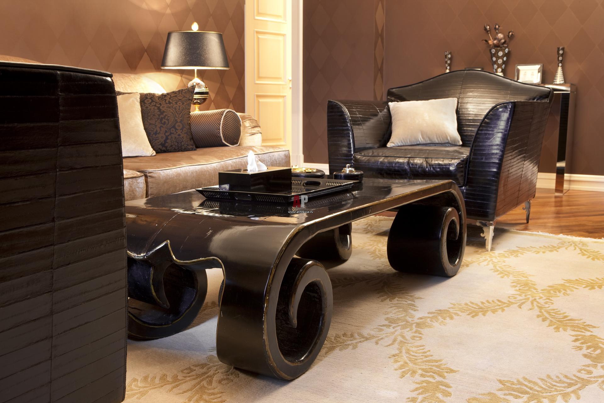 Украшением гостиной зоны служат кресла из кожи угря и китайский антикварный столик, покрытый лаком и имеющий оригинальную форму ножек.
