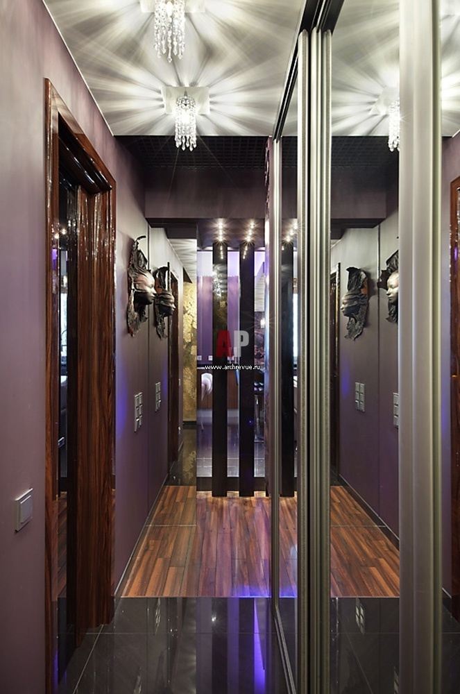 Интерьер прихожей. Обилие зеркал (широких и узких, размещенных на декоративных колоннах и в нишах), игра отражений и переотражений меняют пропорции и сбивают привычные масштабы.