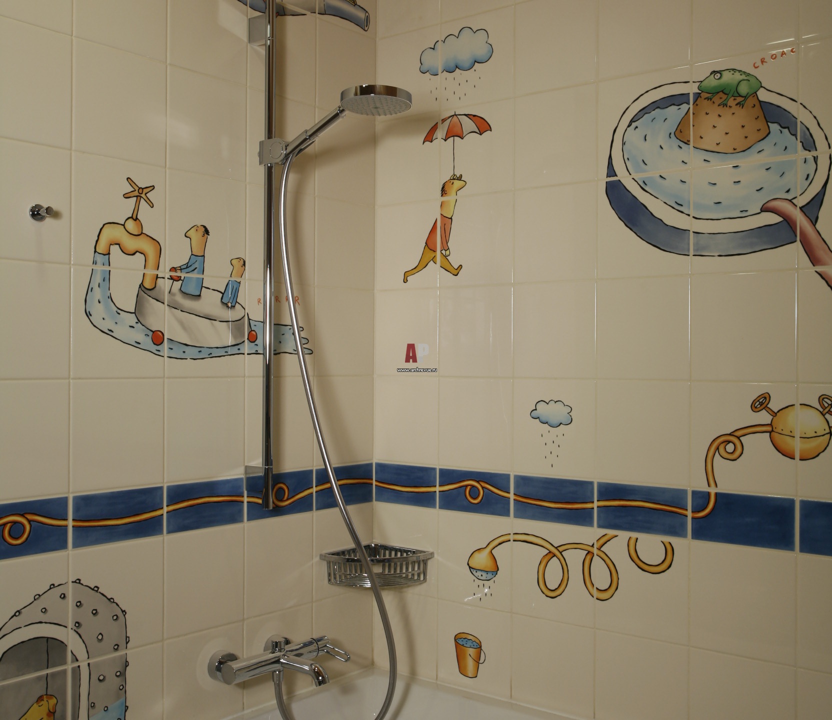 Пол и стены санузла первого этажа выложены керамической плиткой Jasba природных оттенков. В отделке пола детской ванной комнаты второго этажа использована керамическая плитка из коллекции «Н2О» от Revigres, поставщик «Территория керамики»