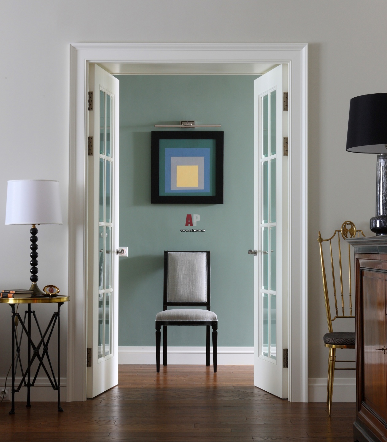 Парадная анфилада гостиной. Наличники, карнизы и плинтуса выполнены из гипсовой лепнины по эскизам. Высокие (2,3 м) двустворчатые двери с остеклением придают гостиной торжественный вид. Картина Михаила Новокщеного из серии «Знаки» собрала различные оттенки интерьера.