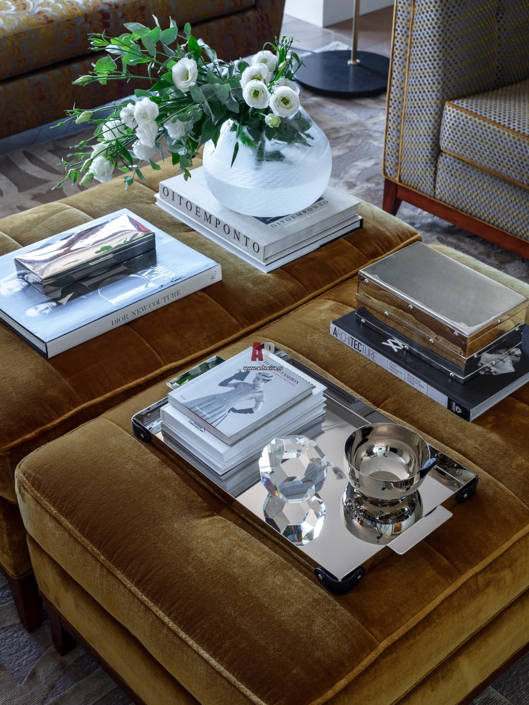 На припыленным серо-оливковом фоне выделяются яркие акценты, которые в свою очередь перекликаются друг с другом: японская ширма со сложным восточным рисунком и охристый пуф в гостиной.