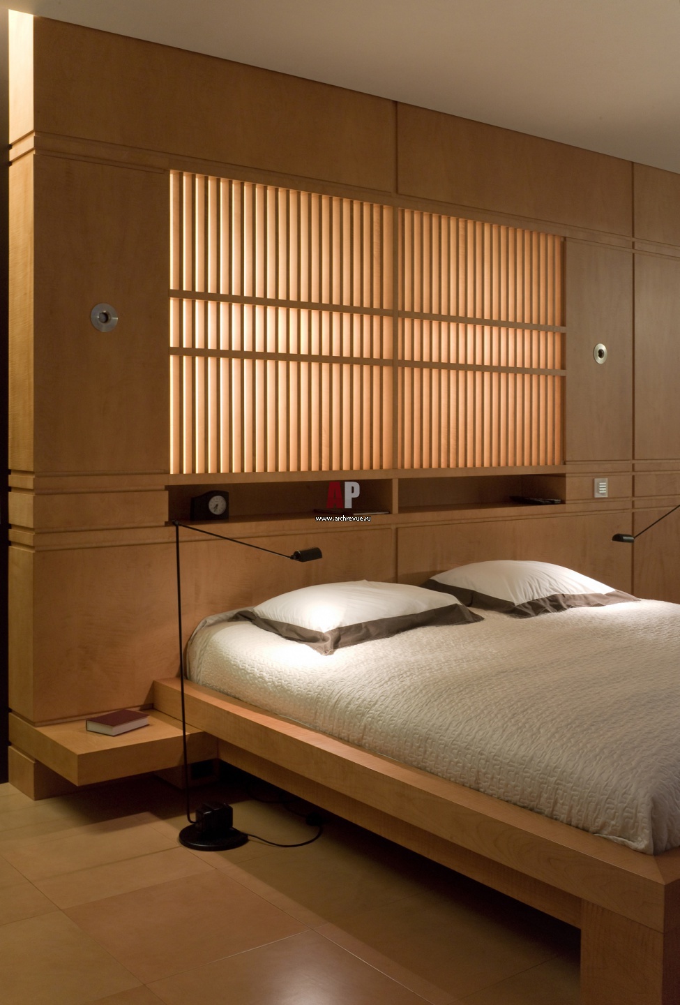 Вся мебель в спальне сделана по эскизу архитекторов. Стены облицованы кленовым панелями Sherle Wagner. Пол кожаный.