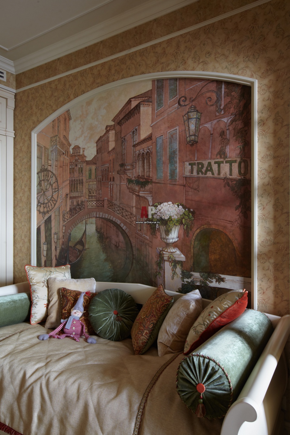 Роспись работы художницы Жанны Яковлевой в детской комнате. Настенное панно с видами Венеции обрамлено гипсовым молдингом.