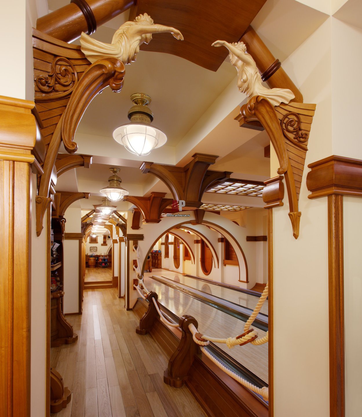 В цокольном этаже размещен боулинг. Он решен в виде корабельного трюма и также выдержан в стиле модерн. Деревянные изделия выполнены по эскизам авторов проекта мастерами компании «СЛК ».