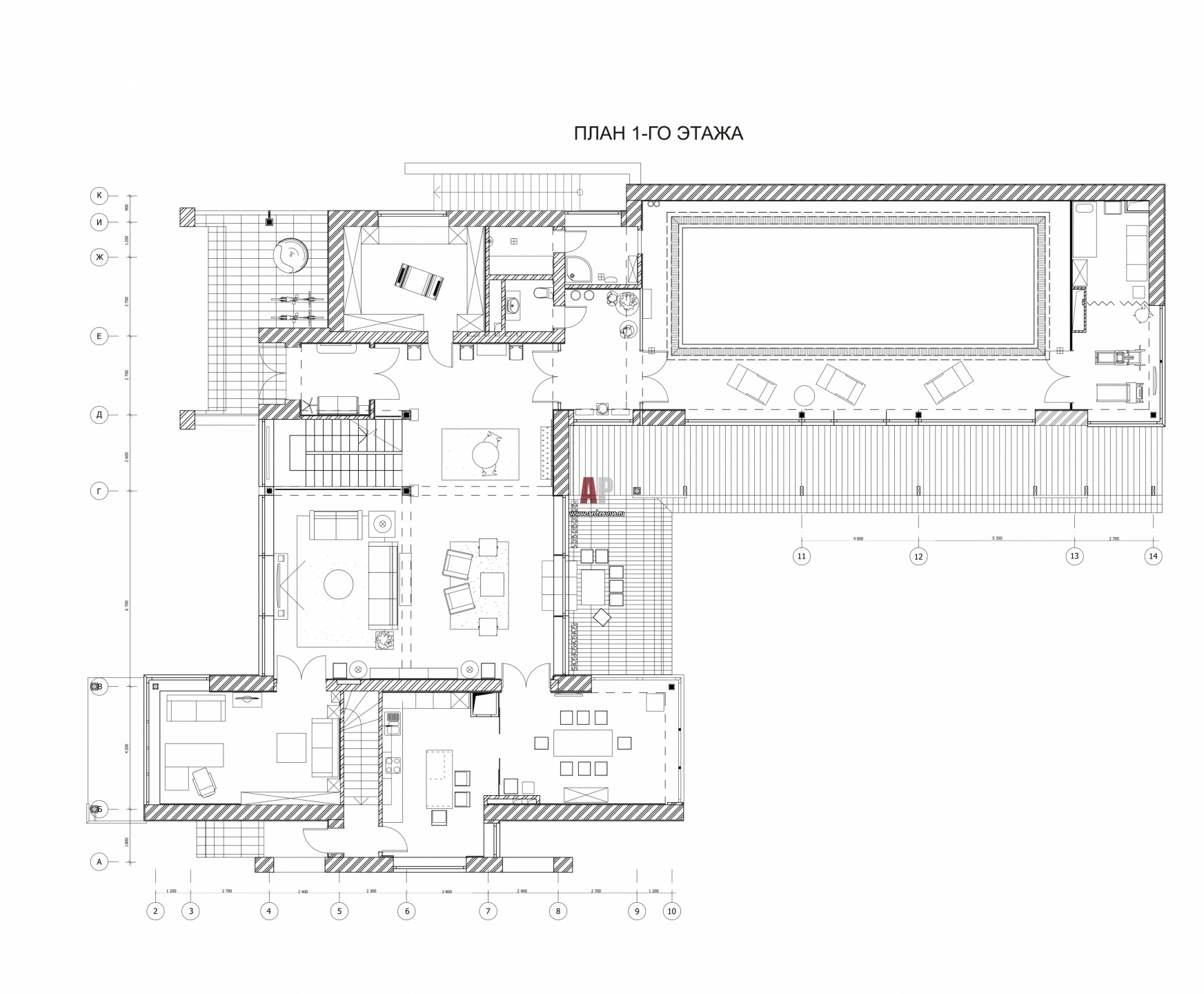 План первого этажа трехэтажного дома в стиле современная классика. Общая площадь - 685 кв. м.