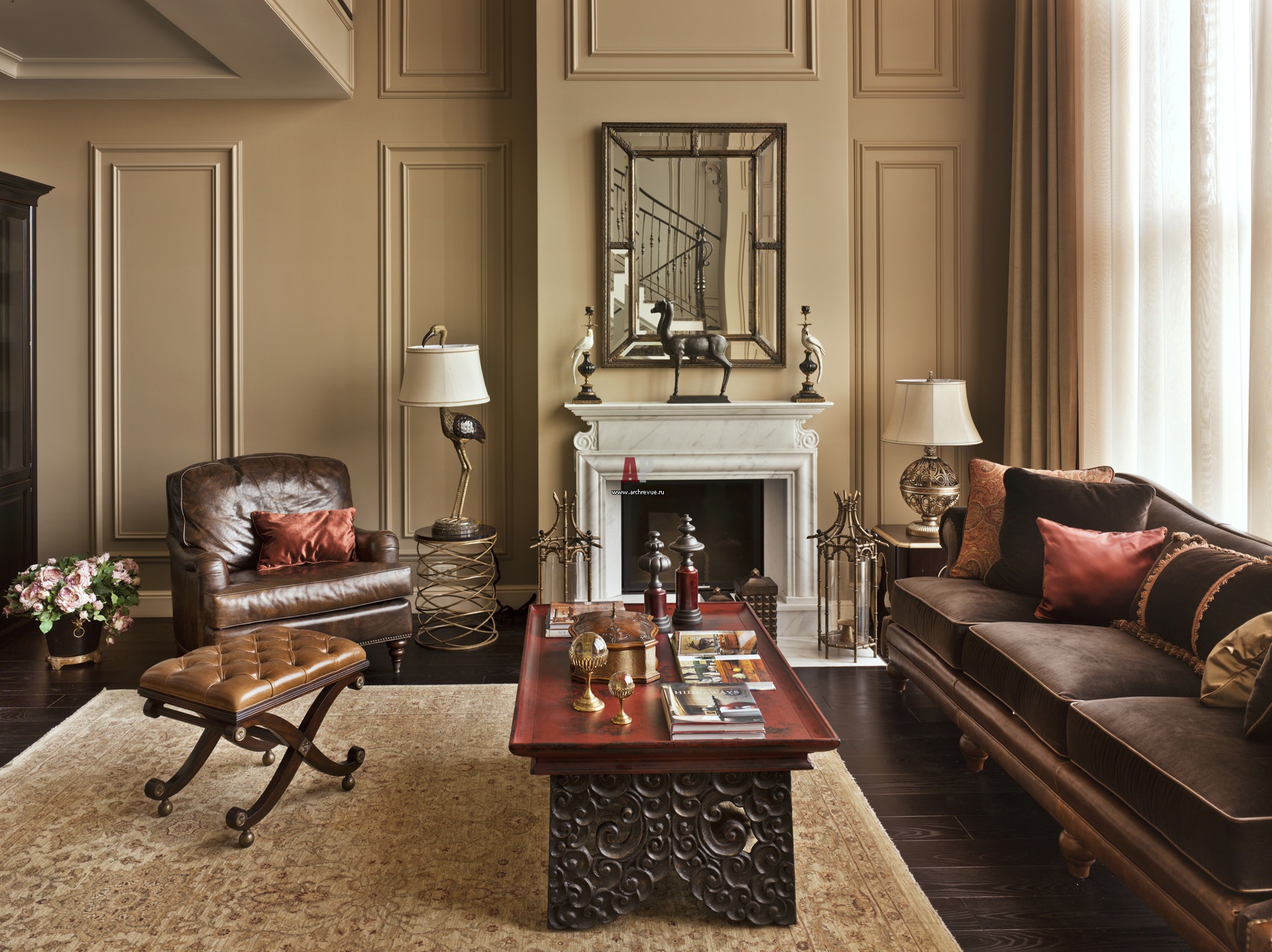 Фото интерьера гостиной в американском стиле с камином. Мраморный портал камина сделан в Испании по эскизу Николая Цупикова. Журнальный столик в стиле шинуазри, шелковый ковер привезен из Ирана. Мебель, аксессуары, поставщик Charles.Cameron.