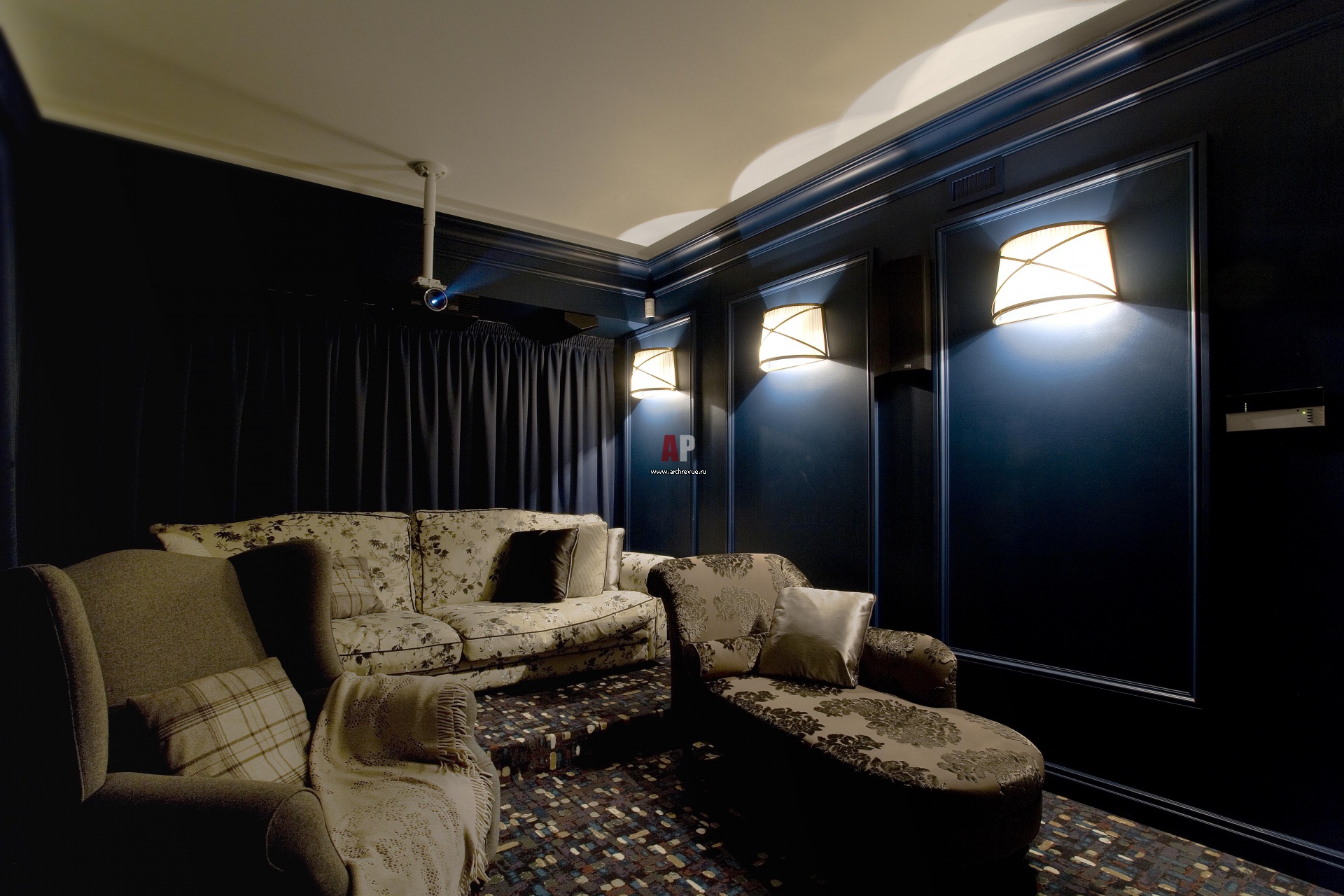 Интерьер домашнего кинотеатра выдержан в темной плотной цветовой гамме. Помещение оснащено дополнительной звукоизоляцией, стены выкрашены в черно-синий цвет.
