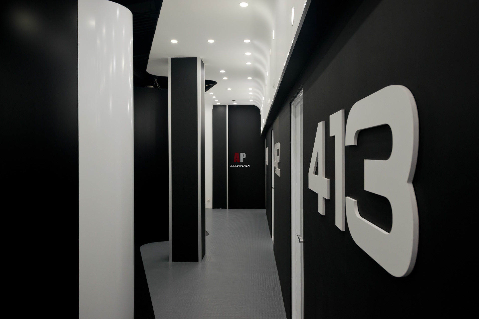 Третий этаж решен в черно-белой цветовой гамме. Сложная пластика стен повторяет дизайн обтекаемых слипбоксов.