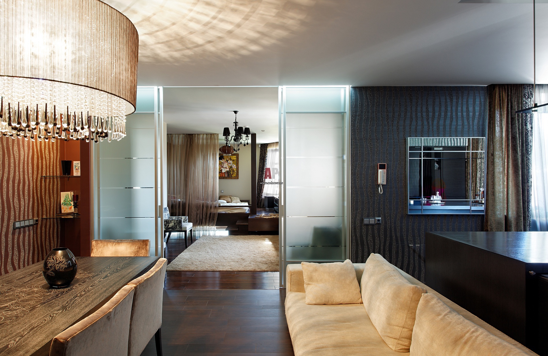 Гостиная с зоной ТВ объединена с кухней-столовой с помощью раздвижных перегородок из матового стекла Deni Lago, поставщик Union.