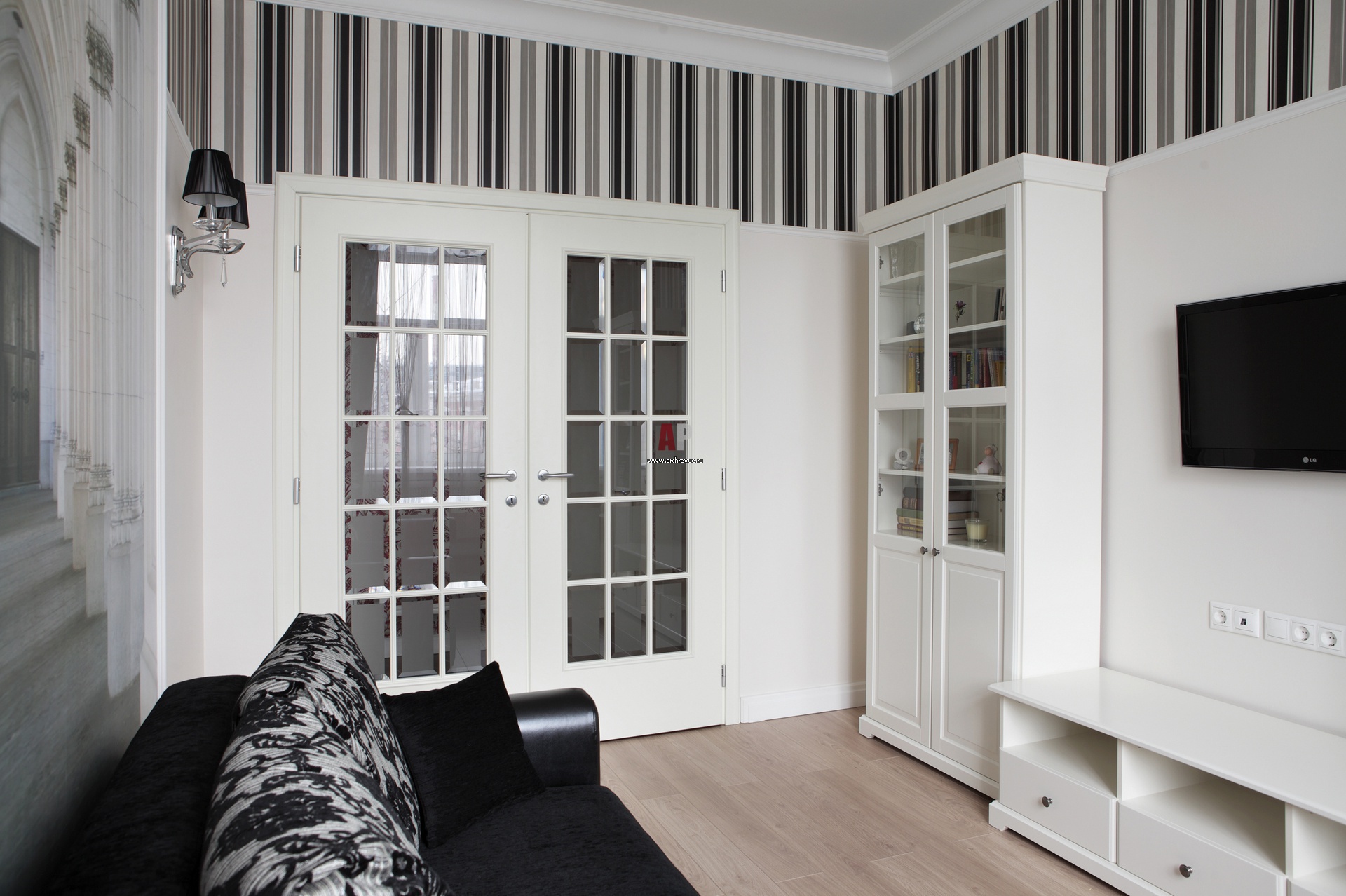 Небольшая черно-белая гостиная. Двустворчатые распашные двери из белого дерева с вставками из матового стекла.