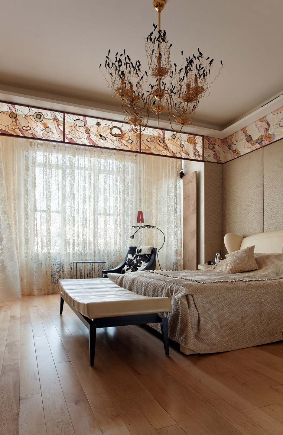Аристократичную атмосферу в спальне создает витраж с использованием полудрагоценных камней (агата), изготовленный «Студия Дарьи Селивановой». На стене он переходит в роспись.