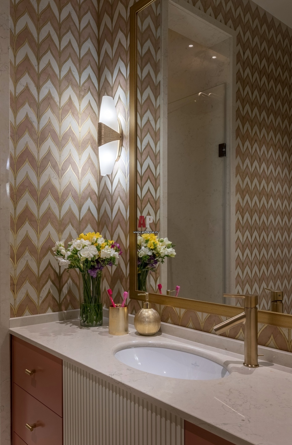 Интерьер детского санузла. Сантехника, Villeroy & Boch. Смесители, Axor, Hansgrohe. Бра, Kelly Wearstler, модель Utopia Large.
