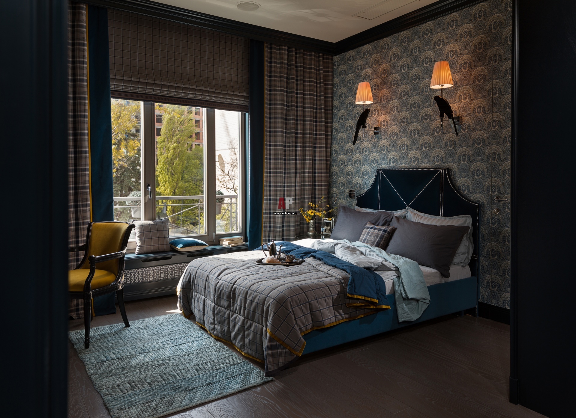 Интерьер квартиры с террасой в историческом центре города Спальня. На стенах – обои в сине-бирюзовой гамме. Шторы из ткани в клетку.